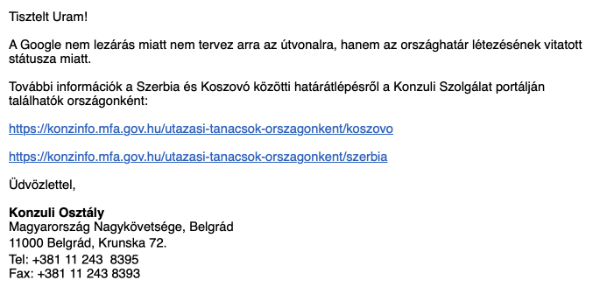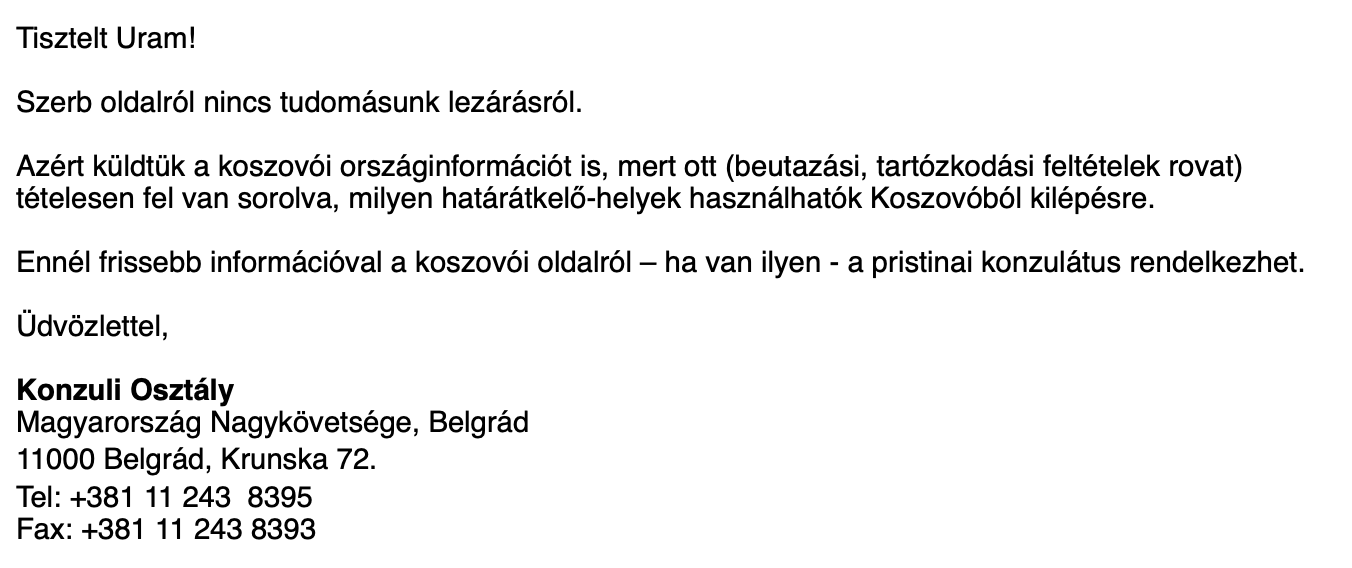 Biztos ami biztos, írtam a belgdrádi nagykövetségünknek emailt, amiben érdeklődtem a határátkelő anomáliája kapcsán. Biztosan nagyon sok dolguk van általában is, így aztán csak 12 óra múlva küldtek egy választ. Idézem: