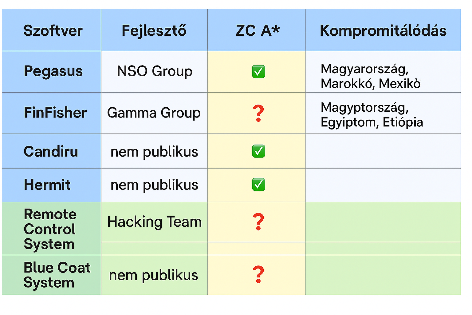 A modern megfigyelő szoftverek listája a teljesség igénye nélkül folyamatosan bővül. Ezek a szoftverek közös jellemzője, hogy rendkívül kifinomult módszerekkel juttatják be magukat a célpont eszközére – akár az Ön telefonjára is –, anélkül, hogy az bármilyen interakciót igényelne.